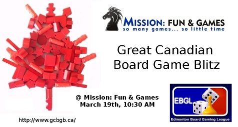 The day of fun starts at 10:30am and runs till around 6:30pm and will be held at Mission:Fun and Games (http://www.missionfunandgames.com), the official EBGL Gaming Headquarters! For more information you can check the Great Canadian Board Game Blitz site at http://www.gcbgb.ca , on the Boardgamegeek forum posting (http://www.boardgamegeek.com/thread/614452/great-canadian-board-game-blitz-edmonton-area-cham) or the Facebook site at http://www.facebook.com/event.php?eid=129953740410875.